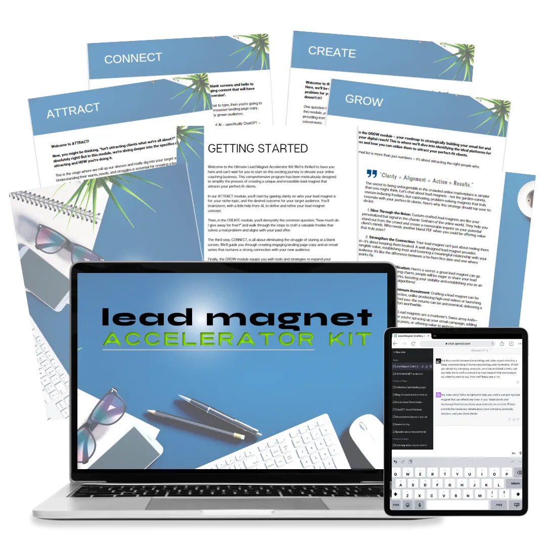 If the thought of starting there makes you hesitate, take a deep breath because we've got your back with our Lead Magnet Accelerator Kit. This AI- enhanced step-by-step process will help you build an email list of fans who connect with your unique message and can't wait to work with you. We're not talking about just growing numbers here – we’re all about fostering real connections with people who genuinely need your services.