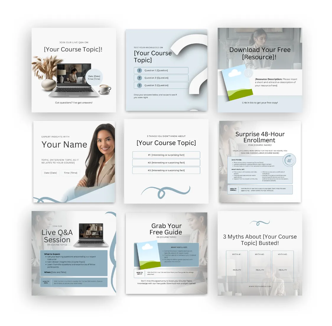 45 ready-to-customize Canva templates for your offer launch posts. Take the guesswork out of what to post and engage your audience effectively. No more racking your brain for ideas—just customize and go!