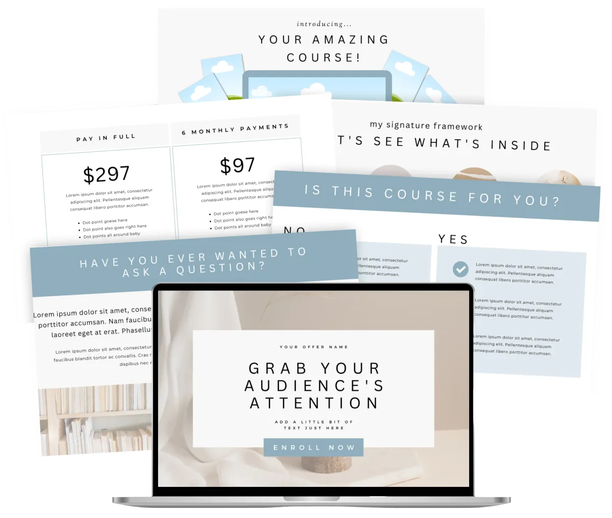 Showcase your offer, pricing, testimonials, and more in this 35-page template. Easily customize colors, text, images, and add your own content and links. Plus, it includes copy prompts to eliminate the stress of figuring out what to write.